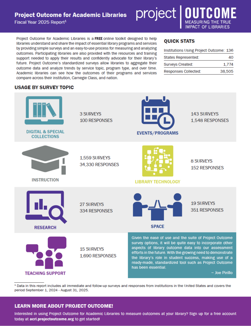 ACRL is pleased to announce the publication of the fiscal year 2024 report for the Project Outcome for Academic Libraries toolkit. Data in this report includes all immediate and follow-up surveys and responses from institutions in the United States and covers the period September 1, 2023 – August 31, 2024.